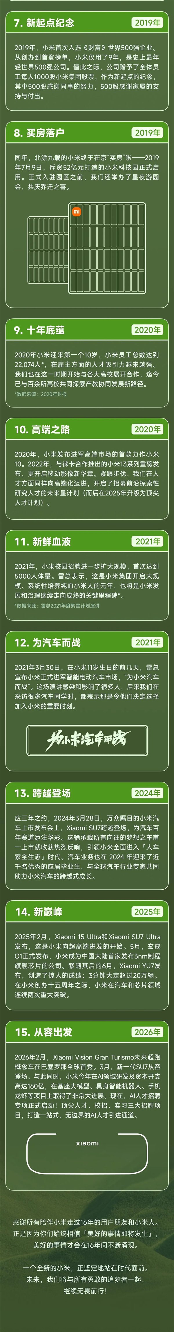 2025年2月,Xiaomi 15 Ultra和Xiaomi SU7 Ultra发布,这是小米向超高端进发的开始。5月,玄戒O1正式发布,小米成为中国大陆首家发布3nm制程旗舰芯片的公司。紧随其后的6月,XiaomiYU7发布,创造了惊人的成绩:3分钟大定超过20万辆。在小米创办十五周年之际,小米在汽车和芯片领域连续两次重大突破。